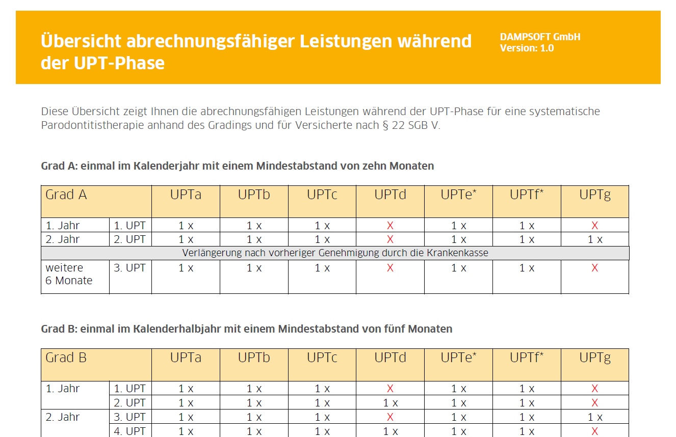 *nur abrechenbar bei Versicherten mit festgestelltem Grad B der Parodontalerkrankung im Rahmen der zweiten und der vierten UPT und bei Versicherten mit festgestelltem Grad C im Rahmen der zweiten, dritten, fünften und sechsten UPT